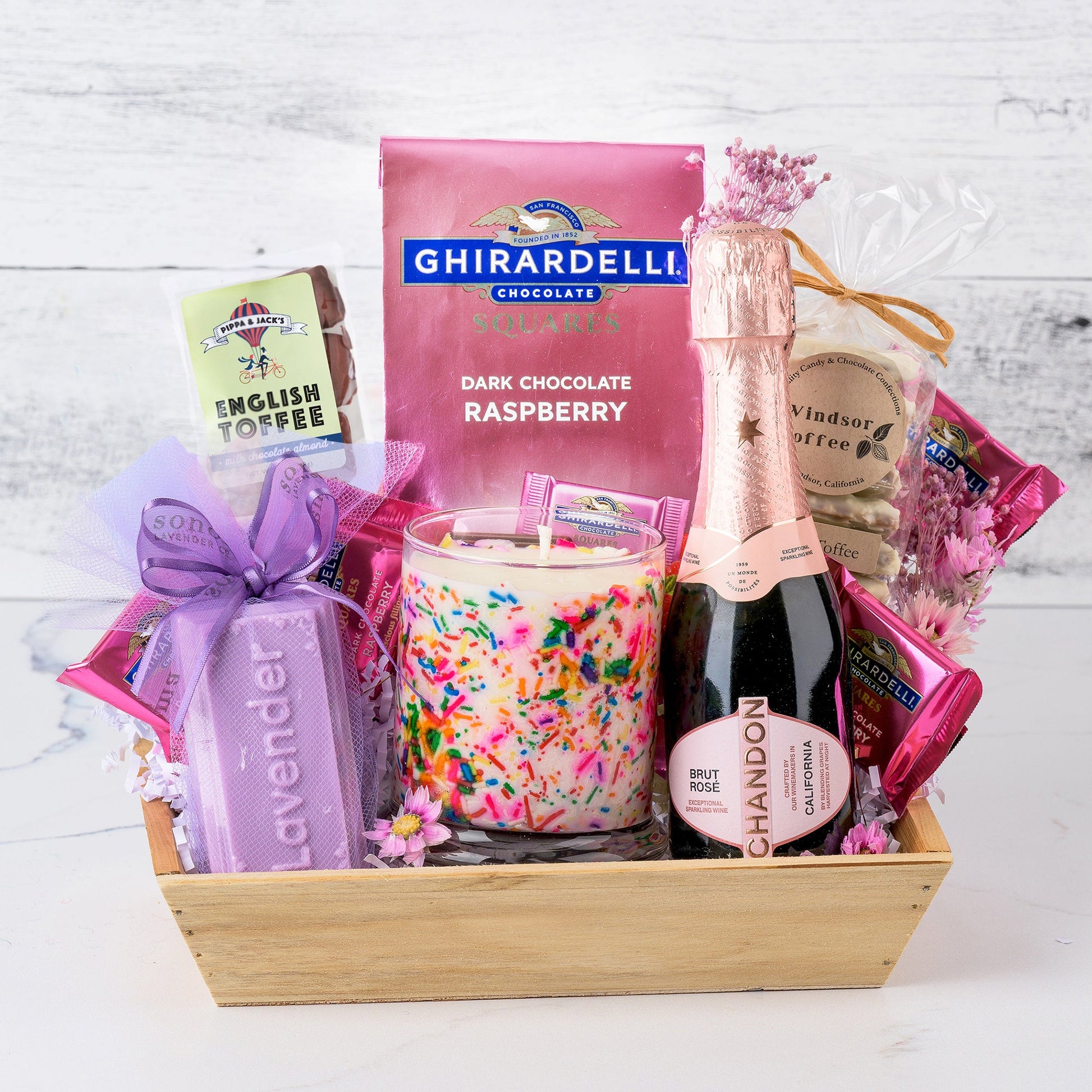It's time for a bubbly birthday bash! You'll have every bit of their birthday celebration covered with this crate full of local goodies like Ghirardelli squares, Windsor Toffee, English Toffee, Lavender Soap, a sprinkled Birthday Cake Candle, and of course a mini Chandon Brut Bubbly.